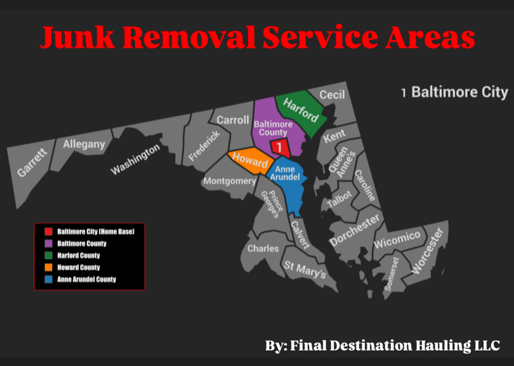 We offer a wide range of quick and reliable junk removal services. From providing a free quote to completing the job, we get things done with both speed and care. Our junk removal services are based locally in Maryland and extend across Baltimore City and the surrounding counties — including Baltimore, Harford, Howard, and Anne Arundel Counties.